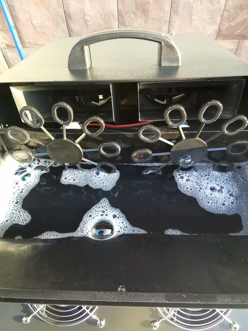 Напряжение: 230В 50Гц Количество колес: 2 Мощность: 100W Количество палочек на колесе: 10 RPM: 60 Кран быстрого слива сзади Управление по DMX512 DMX512: 1 канал Емкость для жидкости: 2,5 л Вес, нетто: 10,5кг Размеры установки: 380/450/470 (мм)