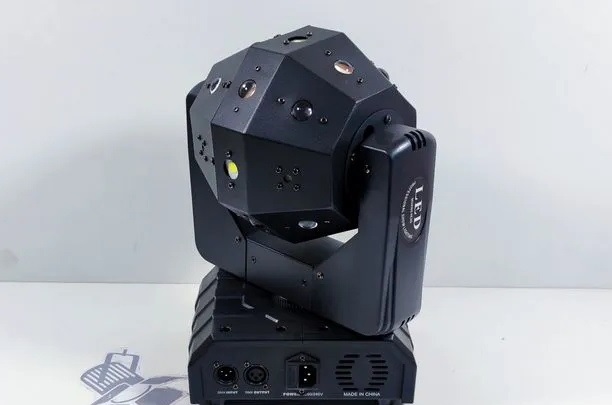 Материал корпуса: пластик+металл Диоды: 16х3вт моно: 4 красных, 4 синих, 4 зеленых, 4 белых Лазер: 2х100мвт красный, 2х50мвт зеленый Стробоскоп: 4х15вт Управление: DМХ, звуковая активация, базовые автопрограммы. Размеры: 22х17х33см Вес: около 5,5 кг