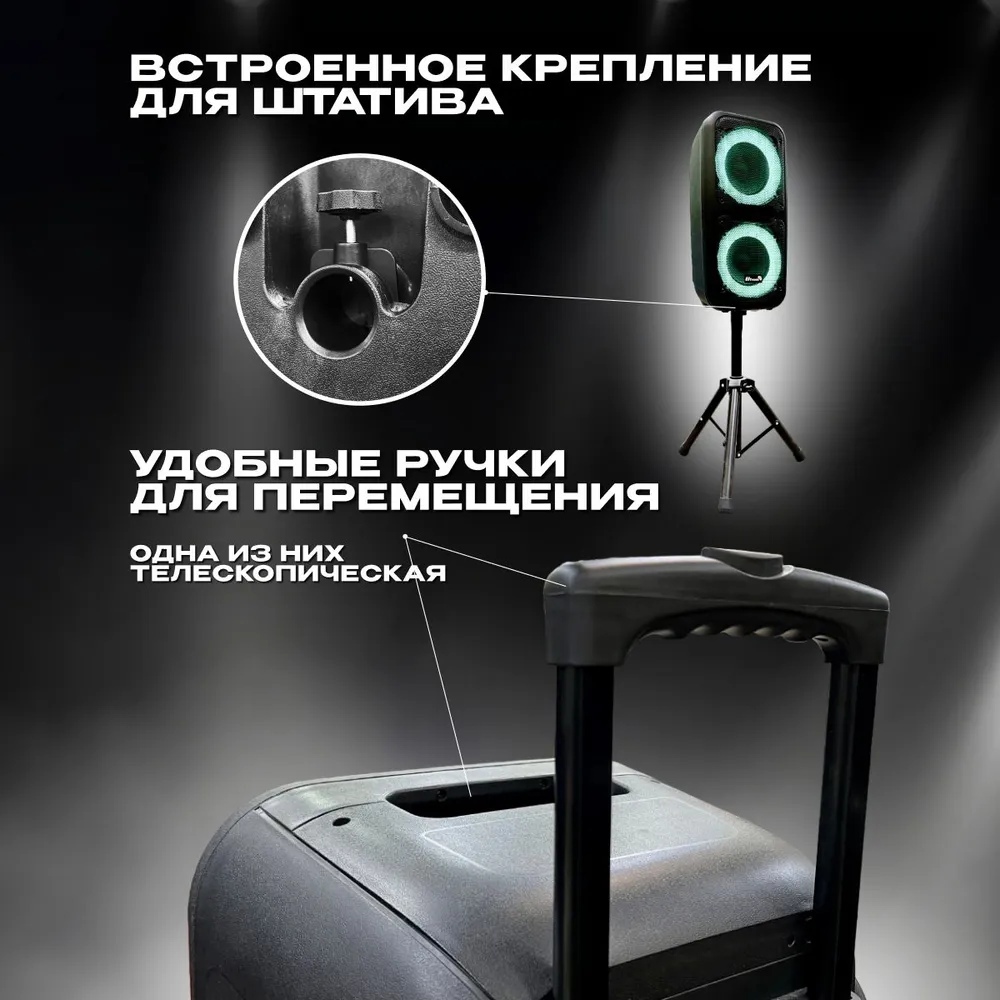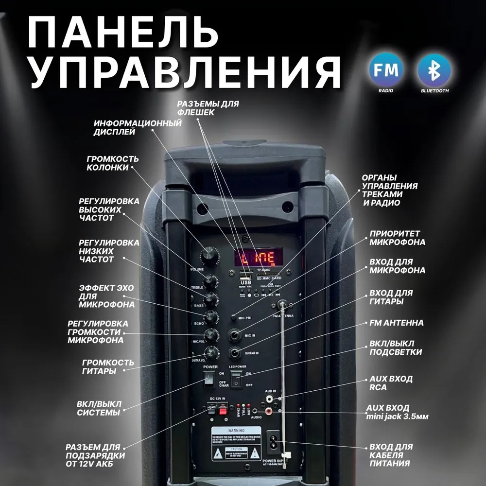 Настройте звук, как надо Вам: есть множество регулировок звука, типа высоких и низких частот, эхо микрофонов, отдельная громкость микрофона и гитары, кнопка приоритета микрофон (автоматическое затухание при активности микрофона). ✅ Bluetooth, AUX, FM радио, USB, Jack 6,3мм. ✅ Телескопическая ручка и колесики (чемодан) ✅ Кол-во колонок: 1 ✅ Кол-во динамиков: 2 ✅ Диаметр динамиков: 8 дюймов ✅ Номинальная мощность: 100 Вт ✅ Пиковая мощность: 130 Вт ✅ Встроенный аккумулятор: Да, до 7ч работы ✅ Возможность подключения доп. Аккумулятора: Да, 12В ✅ 2 беспроводных микрофона ✅ Размеры: Ширина - 30 см Высота - 62 см Глубина - 28 см ✅ LED подсветка (неоновая по периметру) ✅ LED подсветка (подсвечивает динамики, от громкости)