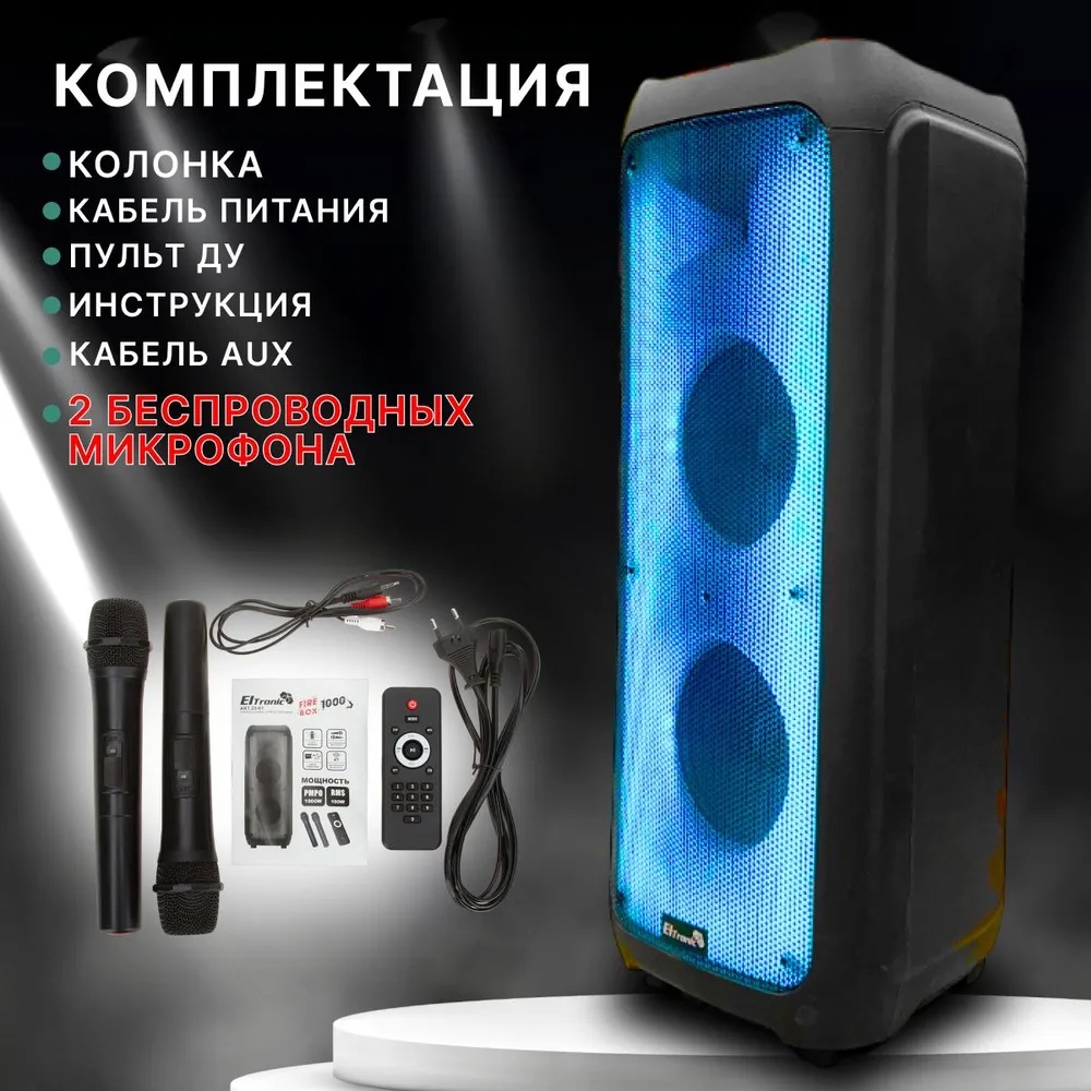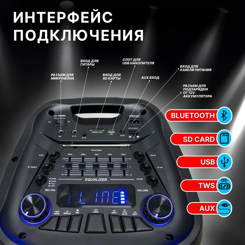 Режимы воспроизведения: - Bluetooth - FM - Внешний накопитель - Aux Мощность: - RMS 100 Ватт - PMPO 1000 Ватт Питание: - 220V - Встроенный аккумулятор 12В 7А (до 5 часов работы) Разъемы: - USB - SD - AUX - Jack 6.3 мм (микрофон-гитара) 2 шт. Комплектация: - Колонка - Кабель AUX - Беспроводной микрофон-2 шт - Пульт ДУ - Инструкция Размеры: Ширина - 41 см Высота - 92 см Глубина - 38 см Вес-19,6 кг Дополнительно: LED подсветка Регулировка громкости микрофона Дисплей Приоритет микрофона Регулировка эхо микрофона Удобная ручка для переноски Колесики 5 полосный эквалайзер