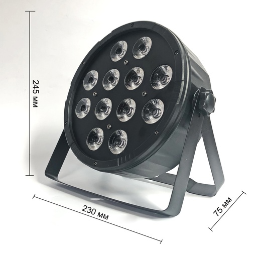 Технические характеристики Led Par 12*12w RGBW: Питание: 220v Потребляемая мощность: 150 Вт Источники света: 12 Led * 12w (мультичип) Цветовая схема: RGBW Угол луча: 30° Диммер: линейный 0-100% Стробоскоп: электронный, регулируемая скорость Управление: Auto, DMX512, Sound, Master/Slave Встроенные Auto программы: есть Встроенные Sound программы: есть Каналы DMX: 8 каналов Разъемы DMX: 3 pin (Вход и выход) Управление: LCD-дисплей, 4 навигационные кнопки Ресурс светодиодов: 50 тысяч часов Материал корпуса: пластик Система охлаждения: вентилятор Размер: 230*245*75 мм Вес: 1,6 кг