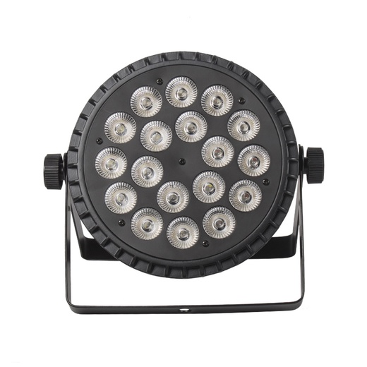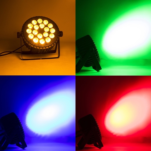 ехнические характеристики Led Par 18*12w RGBW (T): Питание: 220v Потребляемая мощность: 216 Вт Источники света: 18 светодиодов по 12 ватт Тип светодиода: мультичип 4в1 Цветовая схема: RGBW Угол луча: 30°-35° Диммер: линейный 0-100% Стробоскоп: электронный, регулируемая скорость Управление: Auto, DMX512, Sound, Master/Slave Встроенные Auto программы: есть Встроенные Sound программы: есть Каналы DMX: 4/8 каналов Разъемы DMX: 3 pin (Вход и выход) Разъемы PowerCon: Вход и выход Управление: LCD-дисплей, 4 навигационные кнопки Ресурс светодиодов: 60 тысяч часов Материал корпуса: металл Система охлаждения: вентилятор Крепление: 2 лиры для подвеса или горизонтальной установки Размер: 230*120*230 мм Вес: 3,3 кг Led Par 18*12w RGBW (T) – выполнен в надежном корпусе черного цвета, благодаря чему подойдет для любого интерьера. Прожектор достаточно мощный для средних и больших танцполов, заливки стен (Uplighting), архитектурной подсветки. Состоит из 18 светодиодов, мощность каждого составляет 12 ватт. Тип светодиода – мультичип 4в1 RGBW ( красный, зелёный, синий, белый). Основные достоинства Led Par 18*12w RGBW: яркий и насыщенный свет, металлический корпус, вес 3,3 кг, низкая цена. Прибор имеет несколько встроенных программ, звуковую активацию, управление по протоколу Dmx 512.