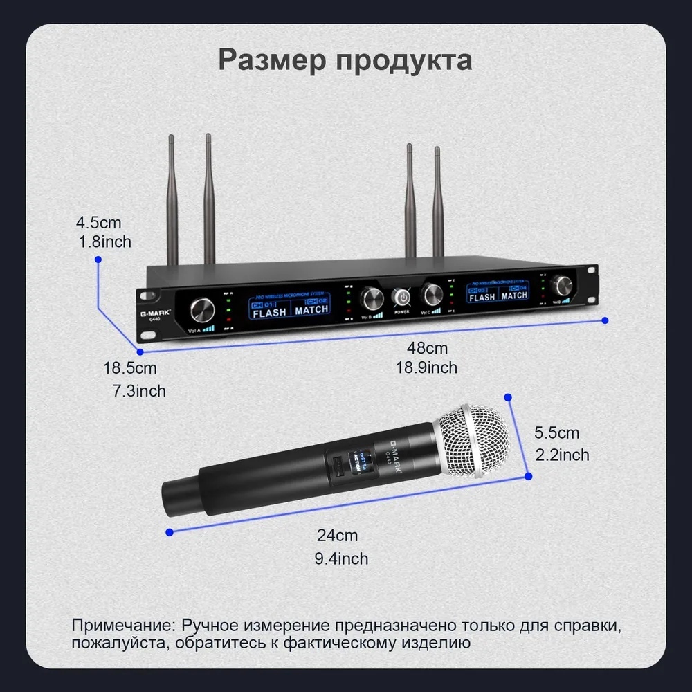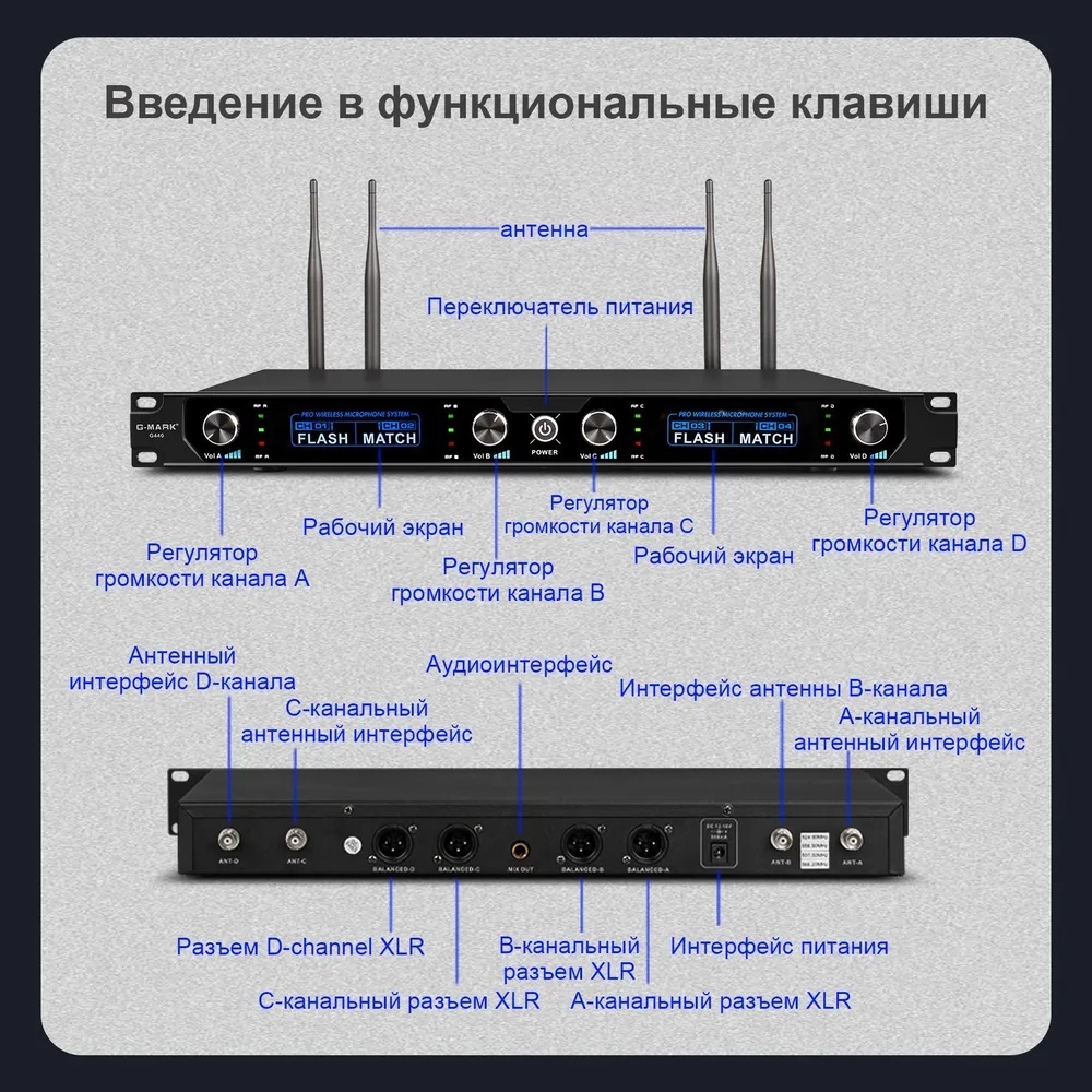 Торговая марка G-MARK Технология подключения UHF Источник питания Batteriebetrieben Аудио чувствительность 80 дБ Вес предмета 3 Килограмма Частотная характеристика 15 кГц Уберите стабильность. 4 канала могут работать одновременно без помех Технология сжатия частоты для уменьшения шума и увеличения динамического диапазона Идеальное отображение рабочего состояния Широкий частотный диапазон, сверхнизкие искажения Четыре длинные приемные антенны