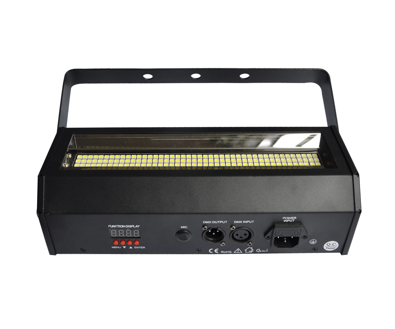 Технические характеристики Led strobe white 60w: Питание: 110-240 В Потребляемая мощность: 60 ватт Источники света: 132 led * 0,2w Цвет светодиодов: белый Тип светодиодов: 5050 Цветовая температура: 7000 К Режимы работы: Auto/Dmx/Slave/Sound Управление Dmx: 2 канала Частота вспышек: 0-25 вспышек/сек. Регулировка яркости: 0-100% Габариты: 340 х 90 х 140 мм Вес: 2 кг Led strobe white 60w – стробоскоп для небольших и средних площадок, кафе и ресторанов, мобильных диджеев. Прибор имеет удобные крепления, благодаря чему свободно размещается под потолком, на стенах или любой плоской поверхности. Возможно отрегулировать скорость стробирования, яркость светодиодов, а также включить режим непрерывного свечения. Удобный интерфейс позволяет осуществлять управление как с помощью панели на корпусе устройства, так и с помощью Dmx пульта. Также имеется звуковая активация. Комплектация: Стробоскоп Led strobe white 60w, сетевой кабель, лира крепления, инструкция.