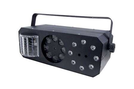 Омывающий свет: 8х1 Вт светодиодов RGBA Гобо эффект: 8х1 Вт светодиодов RGBA Дэрби эффект: 4х1 Вт светодиодов RGBA Красный и зеленый лазеры Спецификация Тип модели Дискотечный светодиодный прибор Источник света 4x1 Вт RGBA LED (эффект дэрби) 8x1 Вт RGBA GOBO LED 8x1 Вт RGBA WASH LED Красный и зелёный лазер Потребляемая мощность, Вт 55 Ресурс, ч 50 000 Эффекты Эффект лунного цветка (дэрби), гобо, стробо/чейз, эффекты лазера Режим работы звуковая активация, режим шоу или DMX, Stand Alone / Master/Slave DMX-каналы 23 Управление DMX Дисплей 4-кнопочный LED Рабочее напряжение, В AC110-240 В 50/60 Гц Разъемы 3-pin XLR In/Out Размер (ШхВхГ), мм 440x220x150 Вес, кг 3,37