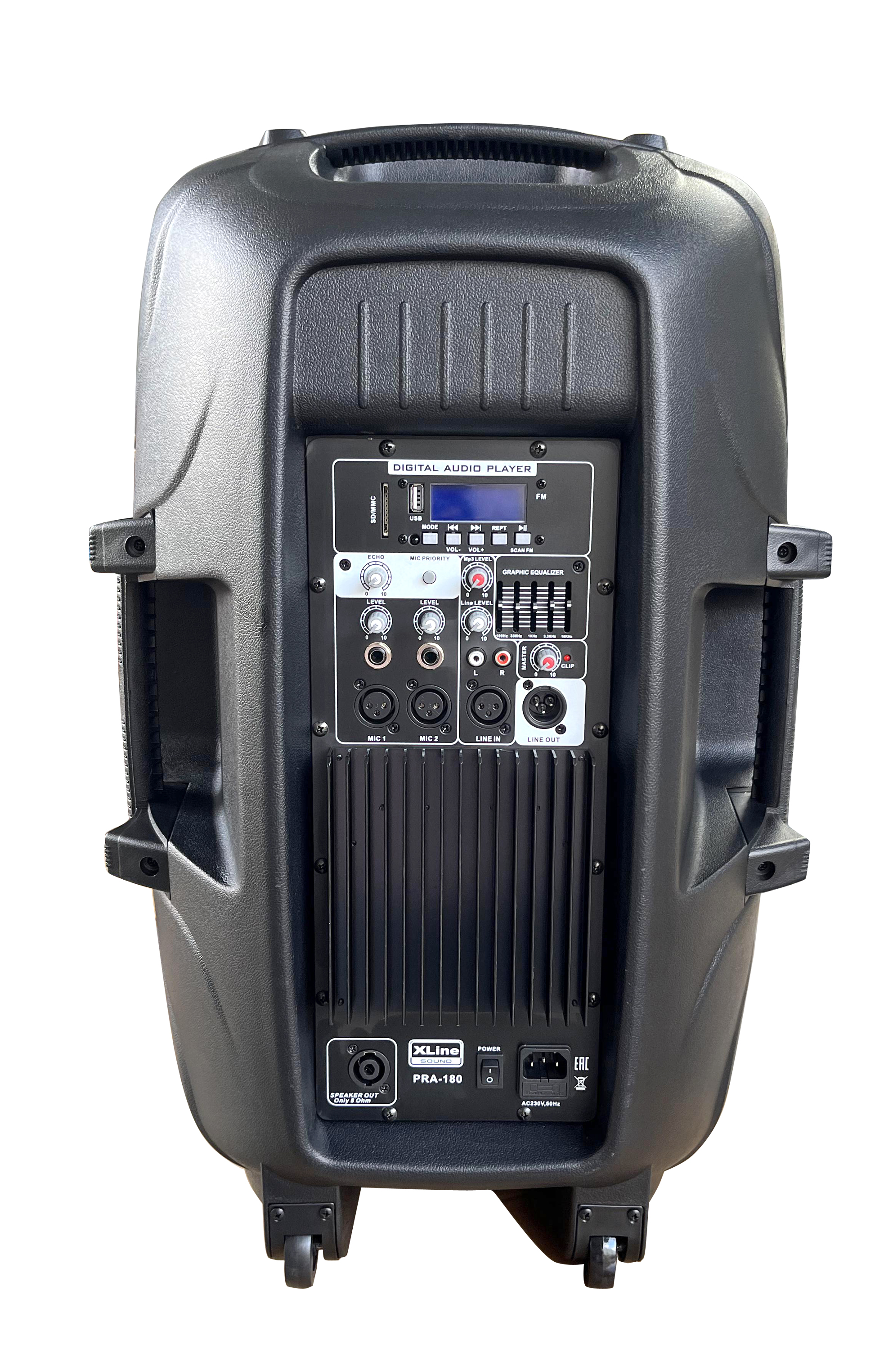 Описание модели Акустическая система активная 2-полосная с MP3/USB и Bluetooth; Возможна установка на пол, на стандартную спикерную стойку, а также использование в качестве сценического монитора. Класс усилителя A/B Номинальная мощность усилителя НЧ/СЧ/ВЧ, Вт 180 Вт RMS Звуковое давление (SPL 1 Вт/1 м), дБ 120 Спикеры 15" Частотный диапазон, Гц 55 - 20 000 Вход 2 х 3-pin XLR (mic) / 6.3 mm Jack (mic); 2 RCA (line in); USB, SD (MP3 плеер) Выход 2 RCA (line out) Материал корпуса Пластик Цвет корпуса Черный Вес, кг 15 (НЕТТО); 16,8 (БРУТТО) Размер (ШхВхГ), мм 445х370х705 Дополнительно ИК пульт дистанционного управления и силовой кабель в комплекте. Удобные транспортировочные колесики. Страна-производитель Китай